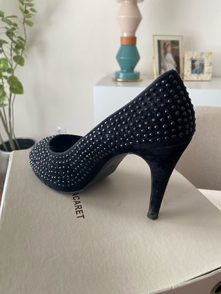 Elegantes zapatos de tacón alto con un diseño adornado con tachuelas. Perfectos para ocasiones especiales. - Acabado en ante. - Punta abierta. - Detalle de tachuelas por toda la superficie.