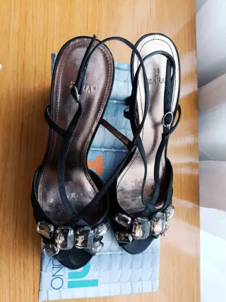 Zapatos de tacón con adornos de pedrería. Talla 38. - Diseño de tiras finas. - Cierre con hebilla. - Pedrería decorativa en la puntera.