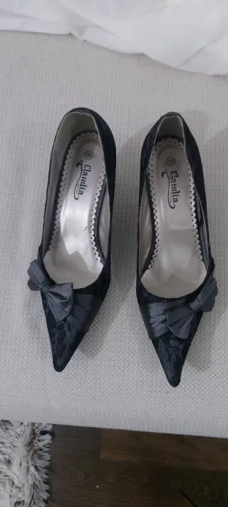 Elegantes zapatos de fiesta como nuevos. Tacón bajo muy cómodo. - Diseño de encaje floral. - Detalle de hebilla. - Tacón fino.