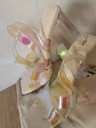 Elegantes tacones transparentes con un diseño llamativo. - Tiras iridiscentes con efecto multicolor. - Tacón grueso y transparente. - Punta cuadrada.