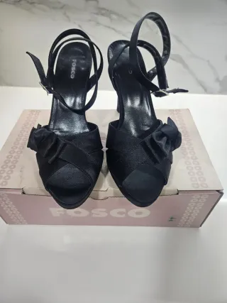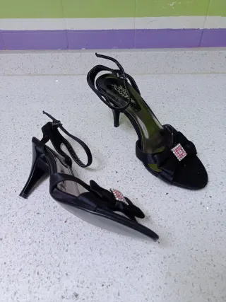 Elegantes tacones negros con un toque brillante, perfectos para ocasiones especiales. - Diseño de plataforma. - Tira ajustable en el tobillo. - Acabado brillante y detalles con purpurina.