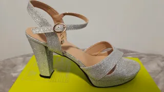 Elegantes zapatos de tacón con un diseño brillante.puestos solo 1 vez - Acabado metalizado. - Punta abierta.