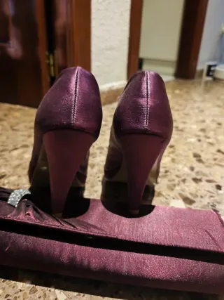 Elegante conjunto de zapatos de tacón y bolso de mano en color buganvilla. - Zapatos de tacón talla 34 - Bolso de mano tipo clutch.