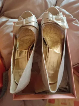 Elegantes zapatos de fiesta en tono dorado, perfectos para ocasiones especiales. Tienen un bonito detalle de lazo en la parte delantera. - Diseño abierto en la punta. - Acabado brillante. - Suela interior con diseño decorativo.