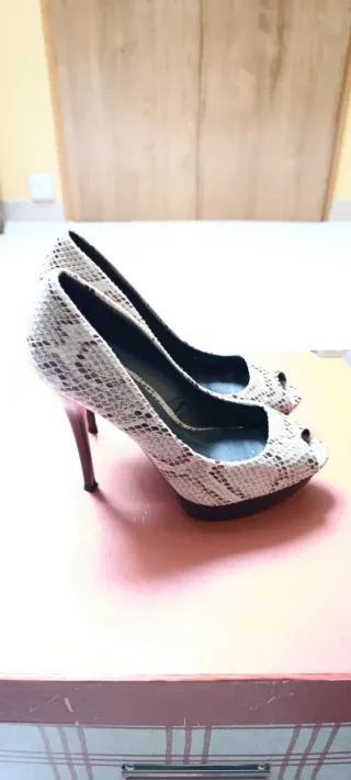 Elegantes zapatos de tacón con estampado de serpiente. Usados una vez - Diseño peep toe. - Tacón de aguja. - Plataforma delantera.
