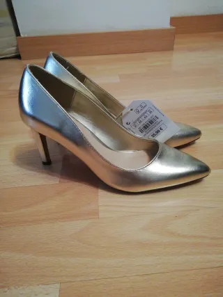 Preciosos zapatos de tacón dorados, ideales para una ocasión especial. ✨ - Diseño elegante y sofisticado. - Material brillante y llamativo. - Tacón alto y estable. - Perfectos para cualquier evento. Sólo se han usado una vez durante el rato de la iglesia.