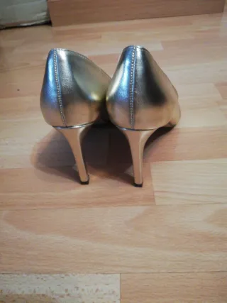 Tacones de tacón bajo/medio en tonos dorado/plateado (la 3ª foto se aprecia el tono exacto bajo luz blanca) Tienen la parte del tacón estropeada, pero se puede arreglar sin mucho esfuerzo. Son comodísimos.