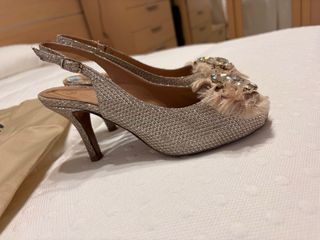 Elegantes zapatos de tacón para ocasiones especiales. - Diseño de sandalia con tira al talón. - Adorno de lazo grande en la punta. - Tacón de aguja alto. - Plataforma delantera.. Los zapatos están como nuevo , utilizado solo en una ocasión, son marrones con brillo Me costaron 60 euros