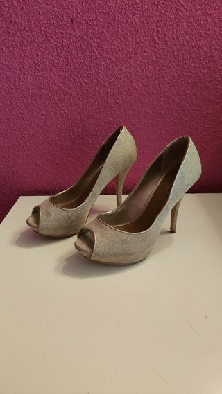 Preciosos zapatos de fiesta de color dorado. Son ideales para una ocasión especial. - Tacón alto y plataforma. - Diseño elegante y sofisticado. - Material brillante y atractivo. - Perfectos para lucir en cualquier evento. Utilizados una sola vez. Están nuevos. - Talla: 37. - Marca: Xti