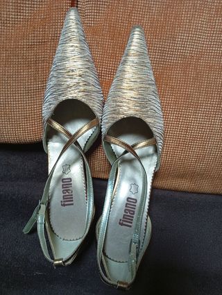 Elegantes zapatos de tacón con un diseño sofisticado. - Acabado metalizado en tonos dorados y plateados. - Tiras cruzadas en el empeine. - Cierre de hebilla en la tira del tobillo. Sólo envíos