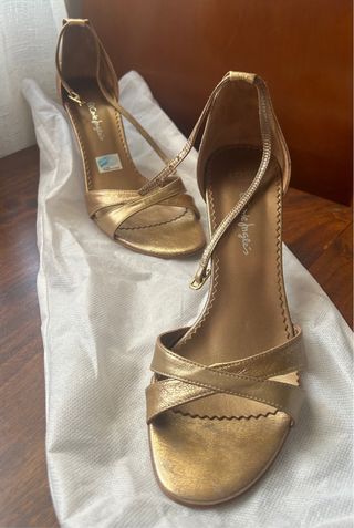 Elegantes zapatos de tacón de la marca Latouche en color dorado. Perfectos para cualquier ocasión. Completamente nuevos, utilizados en una sola ocasion. - Diseño con tiras entrecruzadas en la punta. - Correa ajustable al tobillo con hebilla. - Tacón cuadrado.