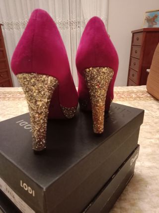 Elegantes zapatos de tacón alto con un vibrante acabado fucsia. - Material exterior de ante. - Detalle de glitter dorado en el tacón y la plataforma. - Diseño de punta redonda .más cosas en mi portal.