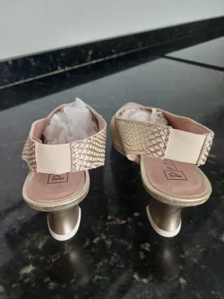 Preciosos zapatos de tacón bajo, color dorado. Ideales para cualquier ocasión. - Son de un material brillante y elegante. - Tienen un diseño sencillo y sofisticado. - Nuevos con etiquetas