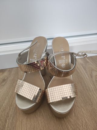 Zapatos dorados Con plataforma y tacon de aguja . Talla 38 marca Frida