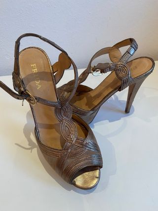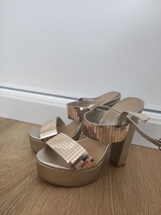 Elegantes zapatos de tacón alto en color dorado. Perfectos para ocasiones especiales. - Diseño con tiras finas. - Tacón de aguja. Puestos una vez.