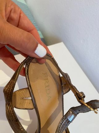Zapatos sandalias de tacón de bloque (chunky heel-9cm) ancho y cuadrado y punta cerrada afiliada de piel. Acabado metalizado en color oro o dorado con tiras hebillas o correas ajustables al tobillo y parte de atrás destalonada (slingback) o abierta para mostrar los talones. Presentan algunas marcas de desgaste (mirar fotos). #boda #bodasbautizoscomuniones #bodas #bodasbautizosycomuniones #bodacomunionbautizo #fiesta #fiestaycoctel #fiestasnavidad #fiestasdefindeaño #nochevieja #nochebuena #ocasionesespeciales #elegante
