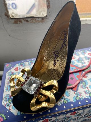 Zapatos stilletto en ante azul, verde y dorado. En la parte trasera se ve una preciosa y original cara de gato. Precio original 120 €