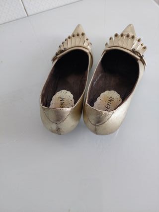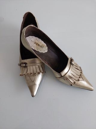 Elegantes zapatos de salón de Ursula Mascaró, talla 38 están sin usar - Color beige con detalles dorados. - Diseño de punta fina. - Tacón fino.