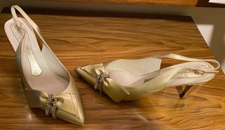 Preciosos zapatos de tacón de color dorado. ✨ Están en muy buen estado y son ideales para una ocasión especial. - Tacón alto. - Diseño elegante con brillantes. - Cierre de hebilla en el tobillo.