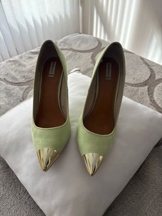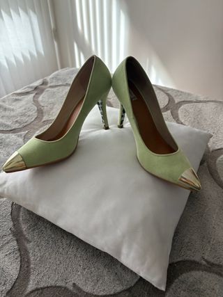 zapato de salon verde agua y puntera dorada con spays nuevos, el zapato tiene poquisimo uso y algún roce que muestro en fotos, tacon de 9 cm