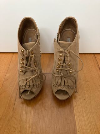 Preciosos botines peeo toe de ante de la marca Uterqüe. Son de color beige y talla 38. - Diseño peep-toe con cordones y flecos. - Detalle de tachuelas doradas. - Tacón alto y fino. - Suela de goma resistente.