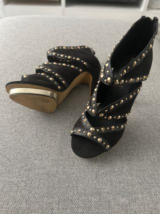 Elegantes zapatos de tacón de la marca SuiteBlanco. - Diseño abierto en la punta. - Tiras adornadas con tachuelas doradas. - Tacón grueso y plataforma. - Cierre de cremallera en la parte trasera.