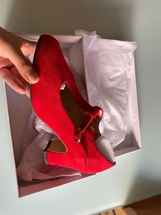 Elegantes tacones rojos con un acabado de ante. - Diseño de tira en T. - Hebilla dorada. - Tacón grueso.