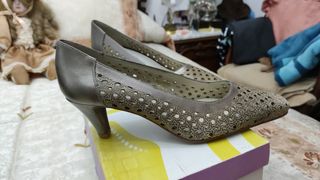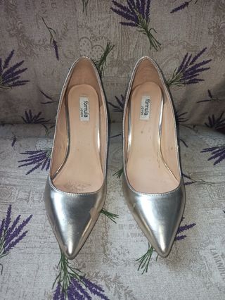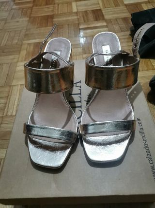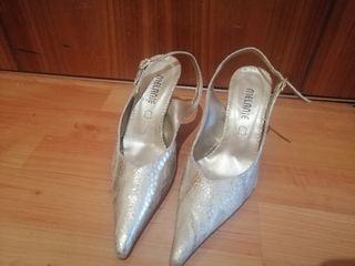 Preciosos zapatos talla 39, aunque yo creo que calzan algo menos, para celebraciones, comuniones, bodas ....plateados y el tacón dorado. puestos dos horas, así que están prácticamente nuevos