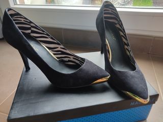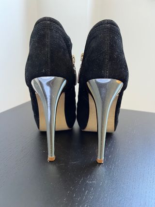 zapato de tacón de ante negro con punta metálica dorado, usado un par de veces