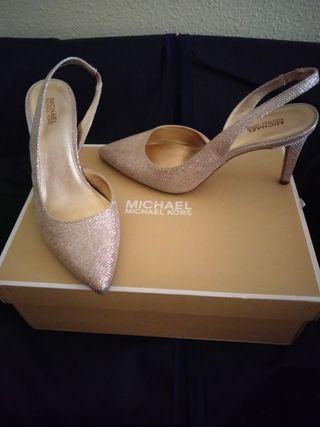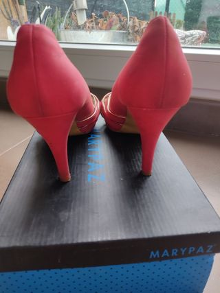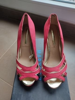 zapato de tacón Pep toe, color coral y dorado, usado un par de veces