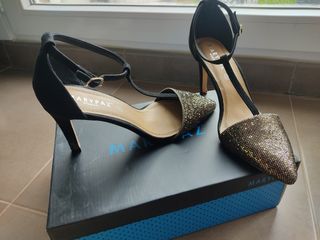 Tacones de color negro con el tacón en dorado, altura del tacón 11.5cm, abiertos en la punta dorada, talla 36, nuevos (se han puesto una sola vez). Hago envíos.