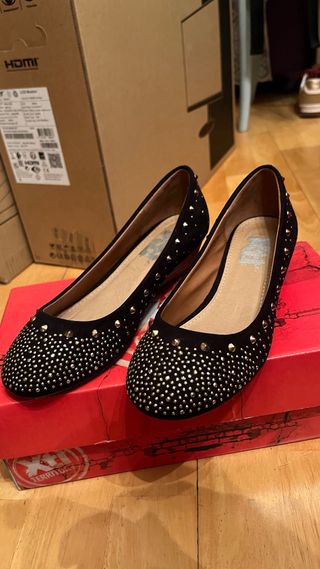 Zapatillas bailarinas de color azul marino. Son de ante y tienen un pequeño tacón dorado. Están en buen estado, aunque presentan un ligero desgaste en la suela. - Tacón pequeño dorado. - Material: ante.