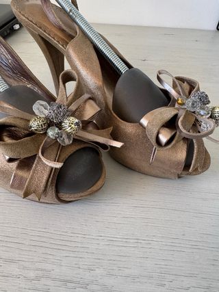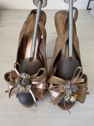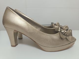 Zapatos de tacón con un poco de plataforma interna, lo que los hace más cómodos. Son de la marca Lodi. Número 38. Color dorado viejo. En perfectas condiciones, ya que sólo se han usado en 3 ocasiones.