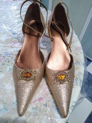 Zapatos dorados de ceremonia, usados en 2-3 eventos; con tacón medio y fino