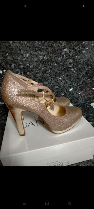Zapato abierto, de tacon alto, color dorado (no es uniforme hace aguas). Son muy cómodos. No tiene marca