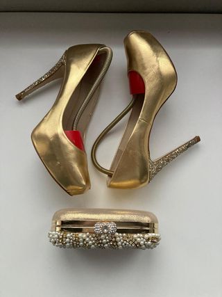 Elegante conjunto para ocasiones especiales, compuesto por unos preciosos zapatos de tacón y un bolso de mano a juego. Ambos están decorados con lentejuelas y cuentas doradas y marrones, creando un diseño sofisticado y único. - Zapatos de tacón con cierre de pulsera. - Bolso de mano con cierre de broche. - Perfectos para eventos de noche, usados una sola vez