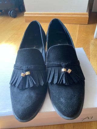 Mocasines negro de ante, de Anna Field, talla 36, con borlas con detalle dorado. Tacón 5,5cm. Como nuevos. Hago envíos.