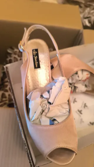 Zapato de novia salón Cuple, abierto en la puntera,suela dorada, color nácar, número 38, puesto en una ocasión, en su caja. Tacón de 7 cm.