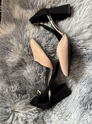 Elegantes zapatos de tacón con un diseño moderno. - Combinación de colores rosa palo y negro. - Tacón grueso y pulsera al tobillo con hebilla dorada. - Punta fina.