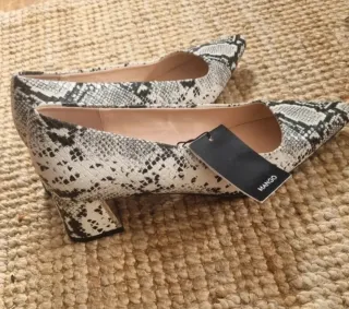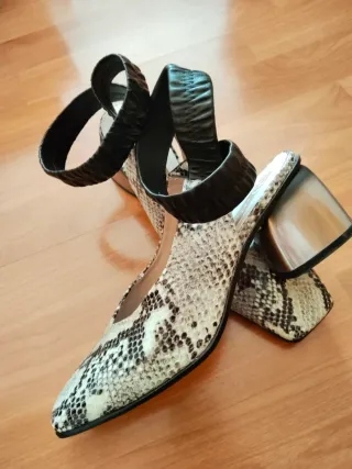 Elegantes zapatos de tacón de Zara con un llamativo estampado de serpiente. - Diseño de punta afilada. - Acabado en piel sintética.