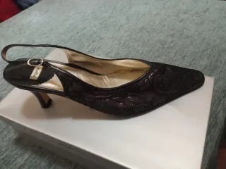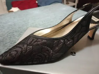 Elegantes zapatos de tacón con un delicado diseño de tela de encaje. - Estampado floral en tonos marrones y negros. - Diseño de punta cerrada. - Tacón de altura media. - Usado un día.