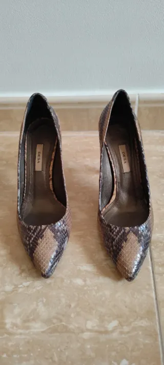 Elegantes zapatos de tacón con un llamativo estampado animal. - Diseño de punta fina. Tiene 2-3 cm de tacón. Ideales para llevar de diario con cualquier out fit - Acabado brillante. Diseño serpiente -Nuevos sin estrenar, lleva los protectores de la tienda. - Los puedes combinar con vaqueros, pantalones vestir, faldas, vestidos...etc combinan con todo.