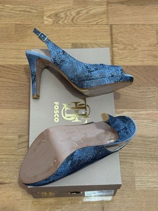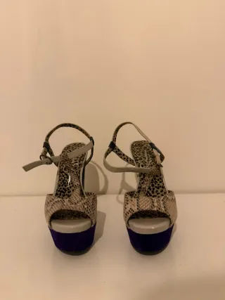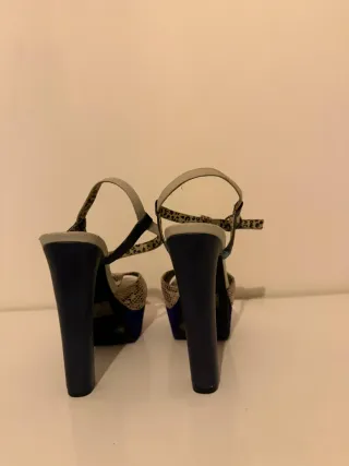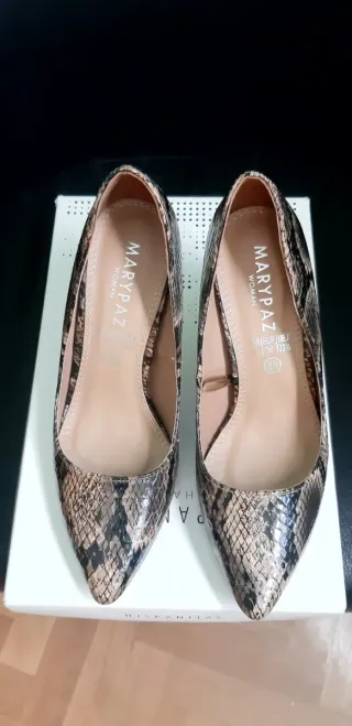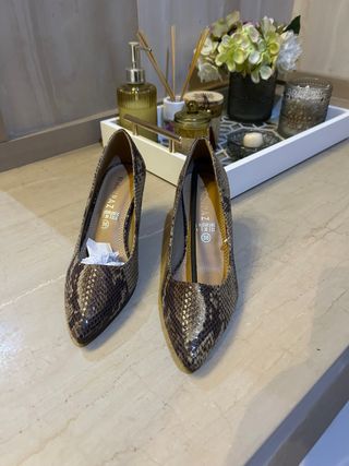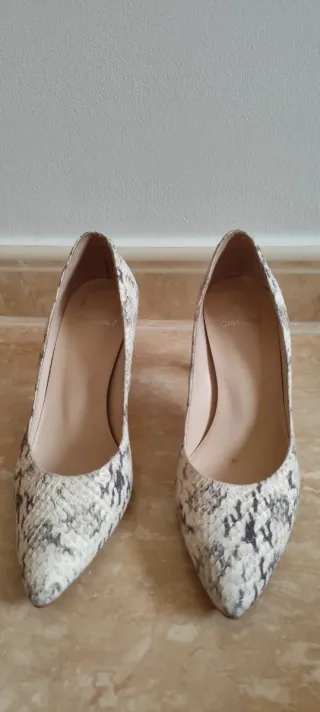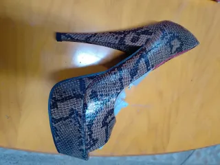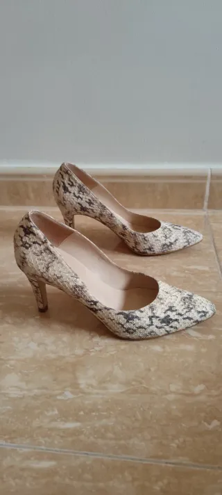 Elegantes zapatos de tacón con estampado de serpiente, usados solo en dos ocasiones. - Diseño de punta fina. - Tacón alto y estilizado. - Acabado brillante.