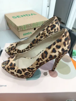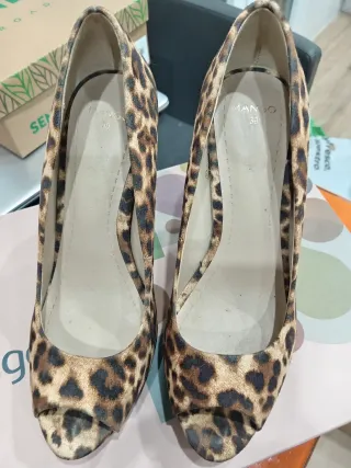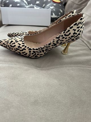 Elegantes zapatos de salón con estampado animal print, puesto solo 2 horas. - Diseño peep-toe. - Detalle de hebilla dorada en la pala. - Tacón alto.