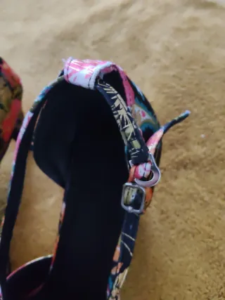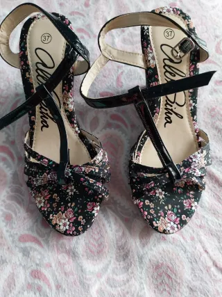 Espectaculares zapatos de baile con un vibrante estampado floral sobre fondo negro. Perfectos para destacar en la pista. Usados solo un día. - Diseño de tiras cruzadas. - Cierre de hebilla ajustable. - Tacón de altura media.