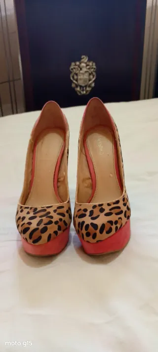 Elegantes zapatos de tacón alto con estampado animal. - Diseño llamativo con estampado de leopardo. - Marca Guess by Marciano. - T-38 - Tapas tacón puestas Tienen dos puestas