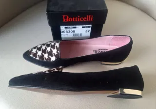 Elegantes zapatos planos de la marca Botticelli. - Diseño de punta afilada. - Combinación de ante negro y estampado. - Detalle metálico dorado en el tacón.
