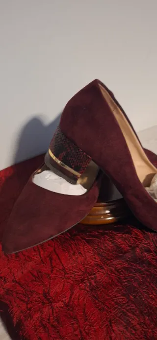 Elegantes zapatos de tacón con un diseño único. - Tacón con detalle de estampado. - Acabado en ante. - Color burdeos y estampado en talón.