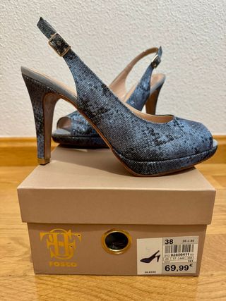 Elegantes zapatos de tacón para mujer con un diseño llamativo. - Acabado en color dorado y detalles multicolor. - Diseño peep-toe con tiras cruzadas. - Tira de tobillo ajustable. - Detalle de perforaciones. - Estampado animal print en algunas zonas. - Sin estrenar Nuevos