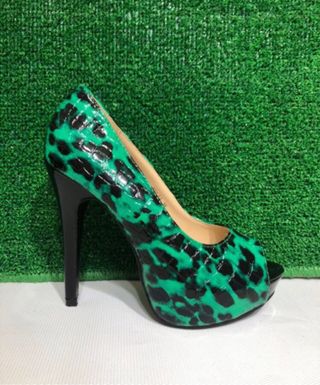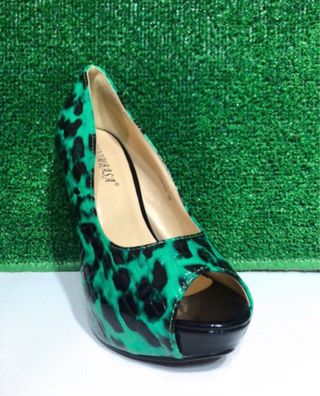 Zapatos Moombasa, peep toe con estampado animal print verde y negro. Plataforma 3 cm, altura tacon 12 cm. Talla 36. Nuevos a estrenar.
